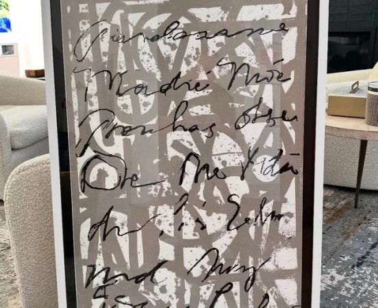 RETNA는 Marquis Lewis라는 본명으로 비밀 언어를 연상시키는 길고 기하학적인 글씨로 덮인 대형 그림으로 유명합니다. 작가의 모양은 이집트 상형 문자, 아랍어와 히브리어 서예, 고딕 블랙레터, 그래피티 등 전 세계적인 영향에서 영감을 받았습니다. RETNA는 로스앤젤레스에서 자라면서 그래피티 아티스트로 시작했습니다. 그 후로 뉴욕, 로스앤젤레스, 런던 등 여러 도시에서 작품을 전시했습니다. 그의 작품은 2차 시장에서 정기적으로 5자리 수에 판매됩니다. RETNA는 Louis Vuitton, Nike, Chanel 등의 브랜드와 협업했으며, Justin Bieber의 앨범 커버를 제작했고, Washington National Opera와 San Francisco Opera에서 Aida를 공연하기 위한 세트를 디자인했습니다.