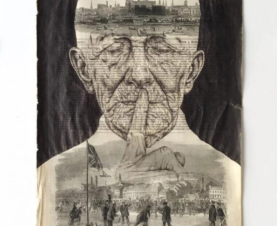 17세기 로 거슬러 올라가는 오래된 지도 , 카드 놀이, 보드 게임 , 정기 간행물, 골동품 문서를 캔버스로 삼은 Mark Powell은 역사에 대한 뚜렷한 감각을 불러일으키는 눈부시고 정교하게 세부 묘사된 펜과 잉크 초상화를 제작합니다 . 단순한 Bic 볼펜만을 사용하여 Powell은 거의 항상 익명의 노인 캐릭터인 피사체를 틀림없는 정밀함으로 그려 모든 선과 주름을 포착하면서 깊이 있고 개인적인 삶의 이야기를 불러일으 킵니다. 그는 피사체와 그들이 묘사된 소재 사이에 연상적이고 종종 섬뜩한 대화를 만듭니다. 그의 작품 중 다수는 서사적으로 모호하지만, American Tourists (2020) 에서 맨해튼 섬 지도 위에 나이 든 아메리카 원주민의 이미지를 중첩한 것처럼 다른 작품에는 사회적 논평 의 틀림 없는 밑바탕이 있습니다.